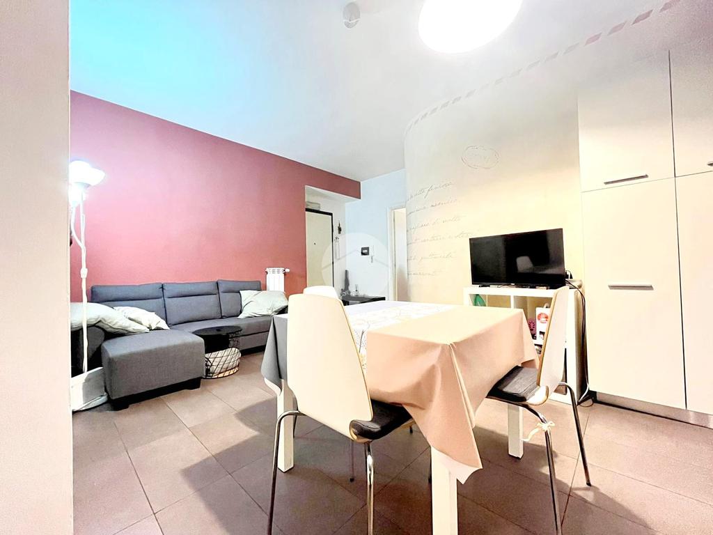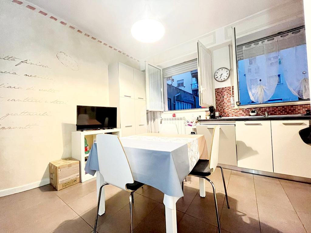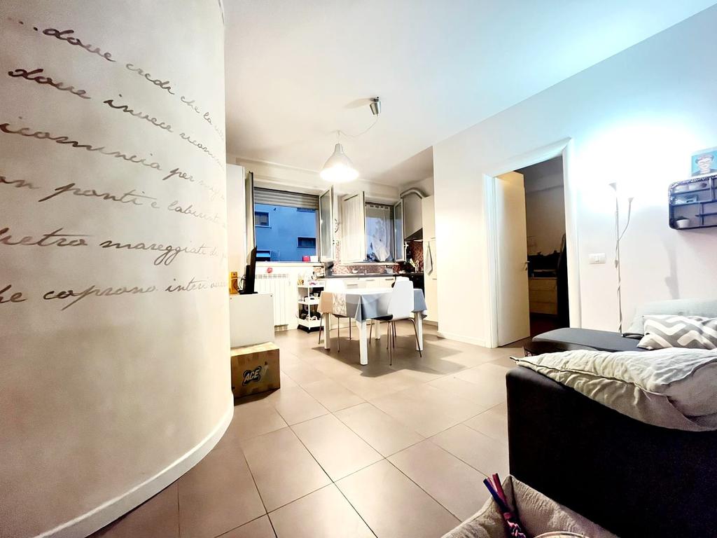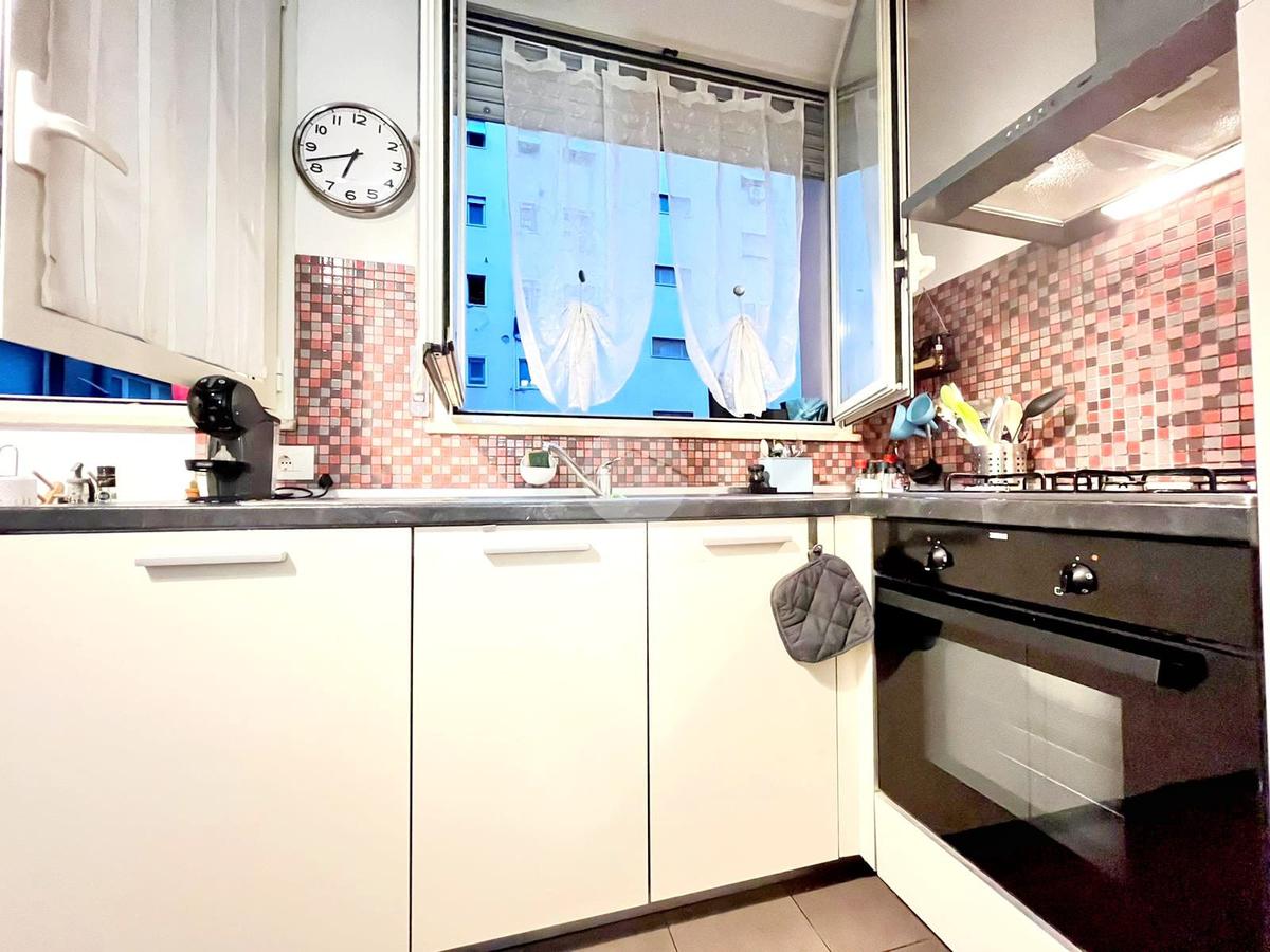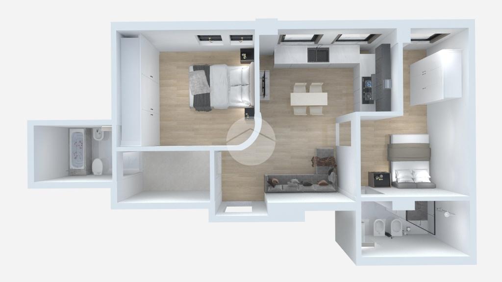 L'appartamento ha una concezione moderna degli spazi: entrando, la zona living è aperta tra soggiorno e cucina. Sulla destra troviamo la zona relax con un il divano ed al centro il tavolo. La cucina è su misura, dotata di tutti gli elettrodomestici. Una doppia finestra rende l'ambiente arieggiato.